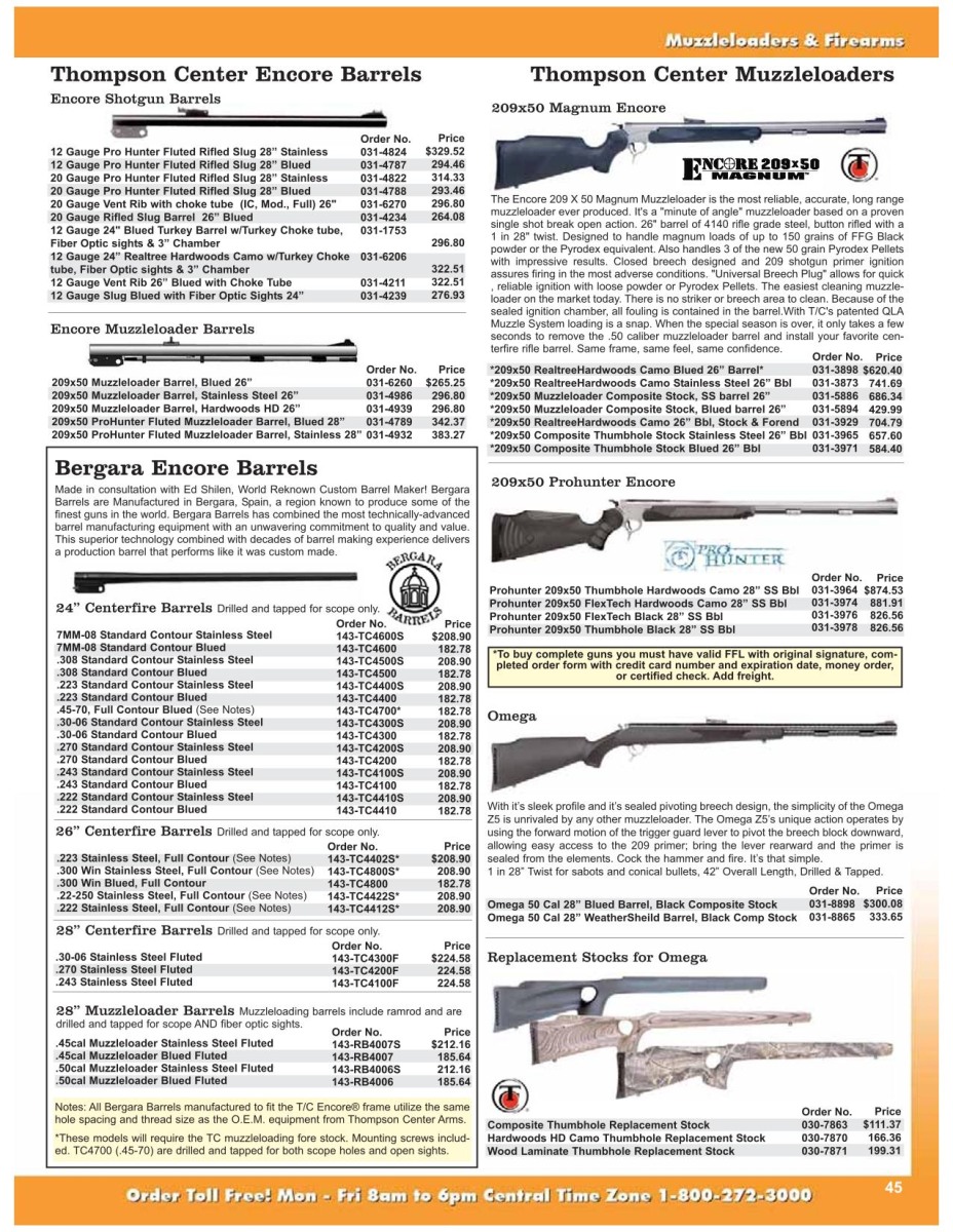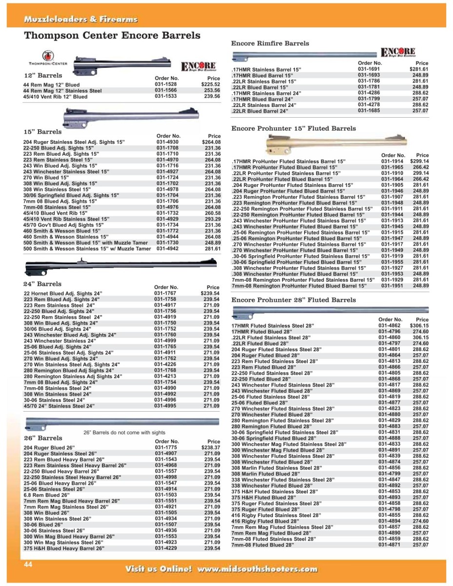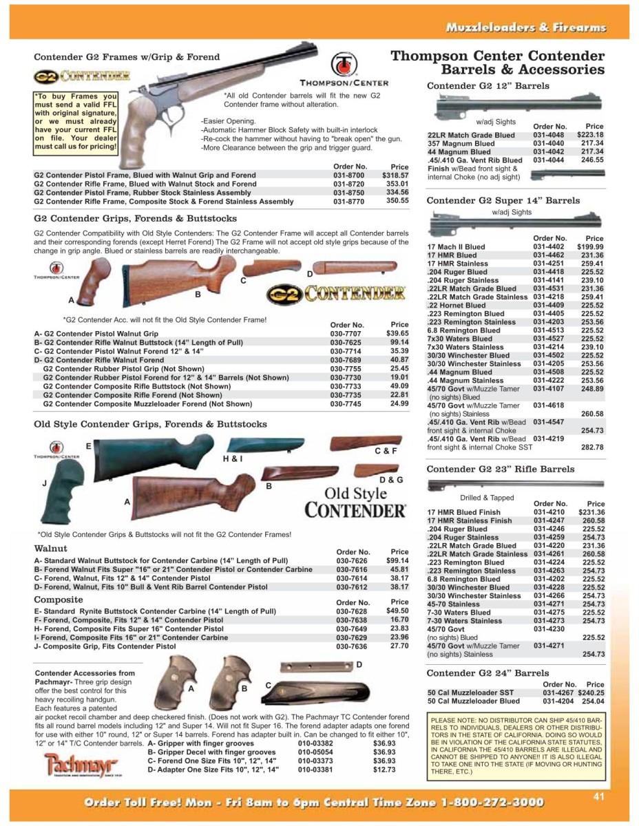 Disponibili per la canna ci sono diverse lunghezze: 10″ (dall’alto), 12″ (dal basso), 14″ (dal 1978) e 16″1/4 (dal 1989). In passato erano disponibili anche canne da 6″ e 8″3/8, ma non sono più in commercio da tempo. I fucili Contender con calcio a spalla e canna lunga sono disponibili con canne da 16″1/4 o 21″. Le calciature sono in noce americano o in Rynite, un materiale sintetico. È importante notare che negli Stati Uniti è illegale detenere un’arma con un calcio a spalla e una canna lunga inferiore a 16 pollici, in quanto si tratta di un’arma lunga a canne mozze, il che può comportare fino a 5 anni di carcere e una multa fino a 10.000 dollari. Questo spiega perché la canna più corta dei fucili Contender misura 16″1/4.