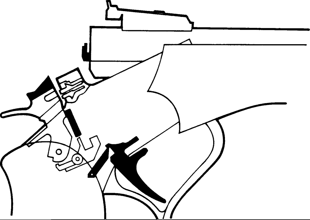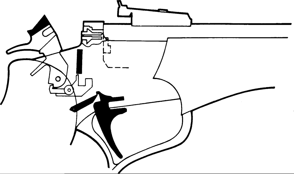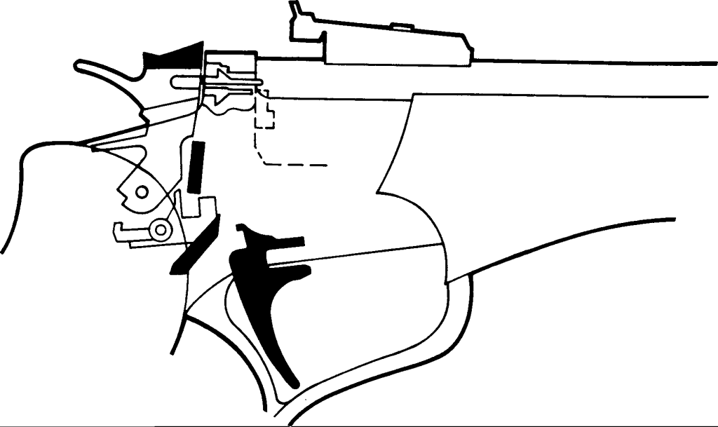 Come funziona una Contender? Verrà spiegato passo dopo passo, partendo dall’arma chiusa con il cane abbassato, cioè nella situazione in cui si trova dopo aver sparato. La pistola è bloccata, il cane poggia sul percussore e sulla struttura dell’arma, mentre il percussore sporge nella camera di sparo.