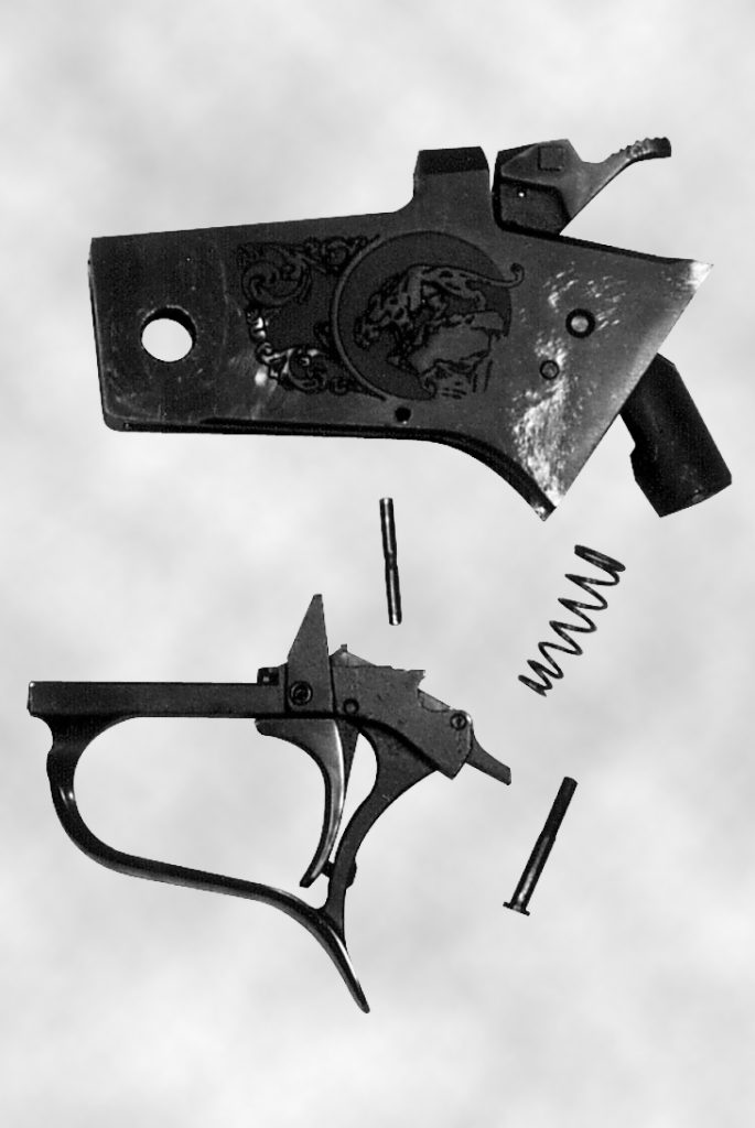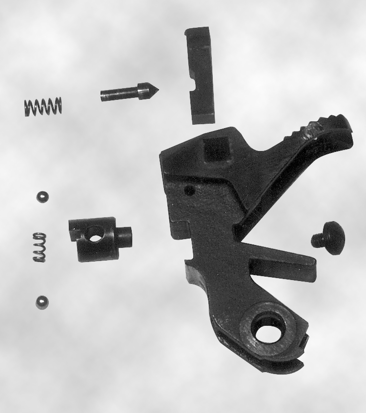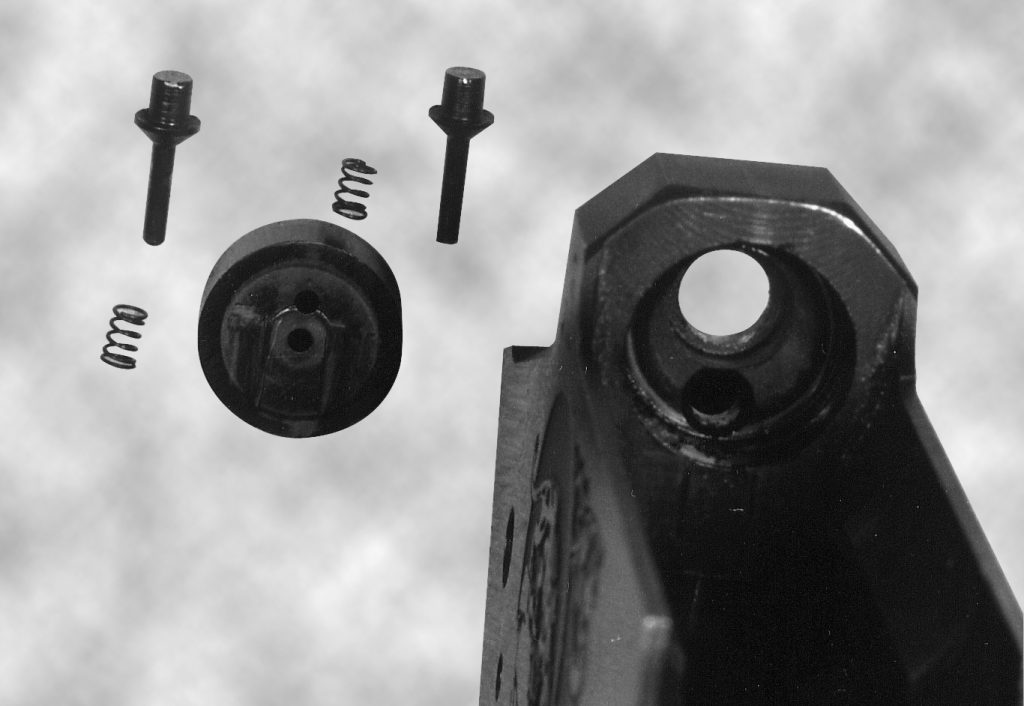Si tratta di un nuovo modello, molto più affidabile del precedente. Da notare che il percussore non sporge nella cavità di sparo in questo momento. Rimuovere il grilletto spingendo via il suo perno (è il più piccolo dei due rimasti nel telaio, l’altro è quello del cane).